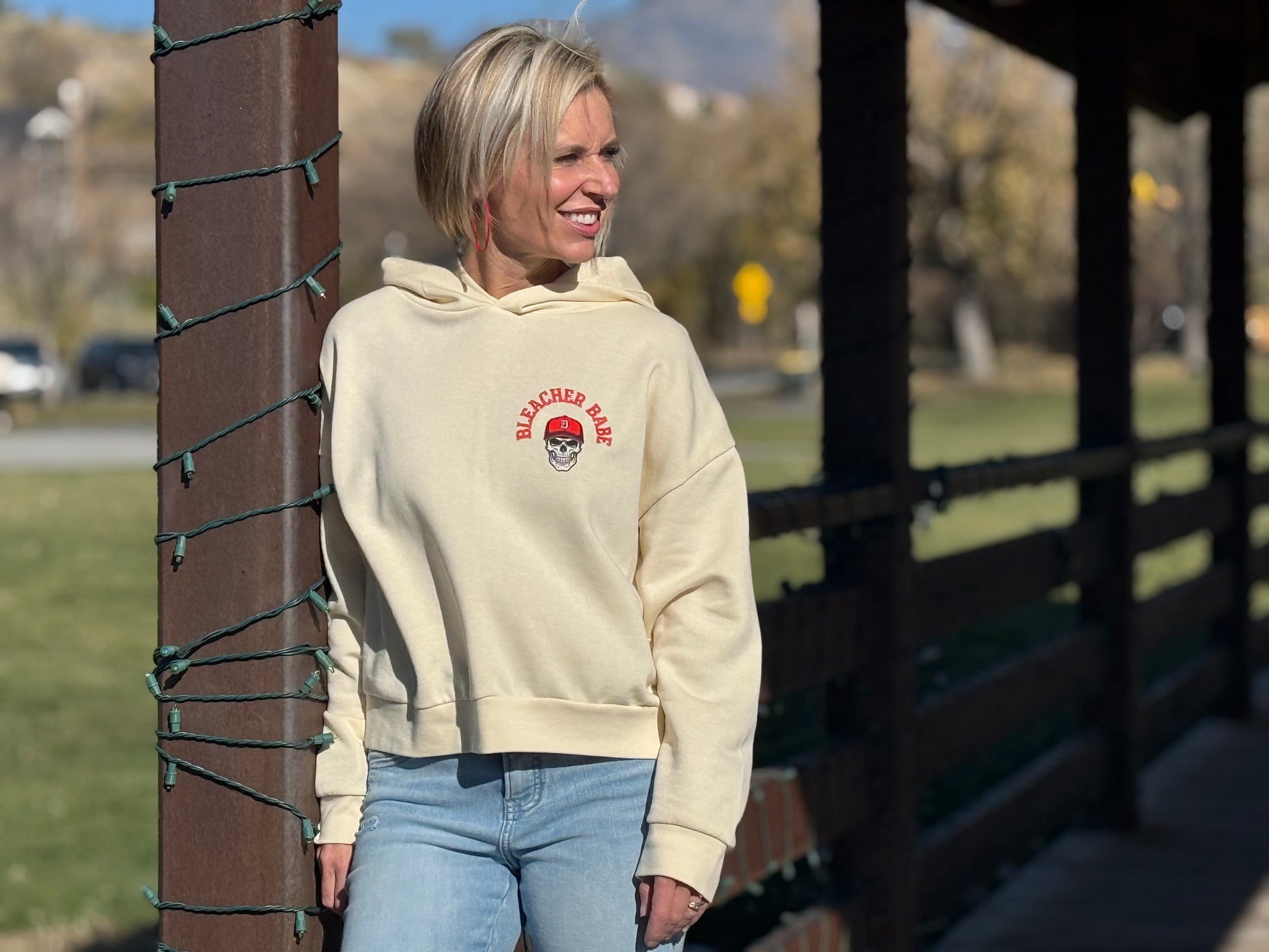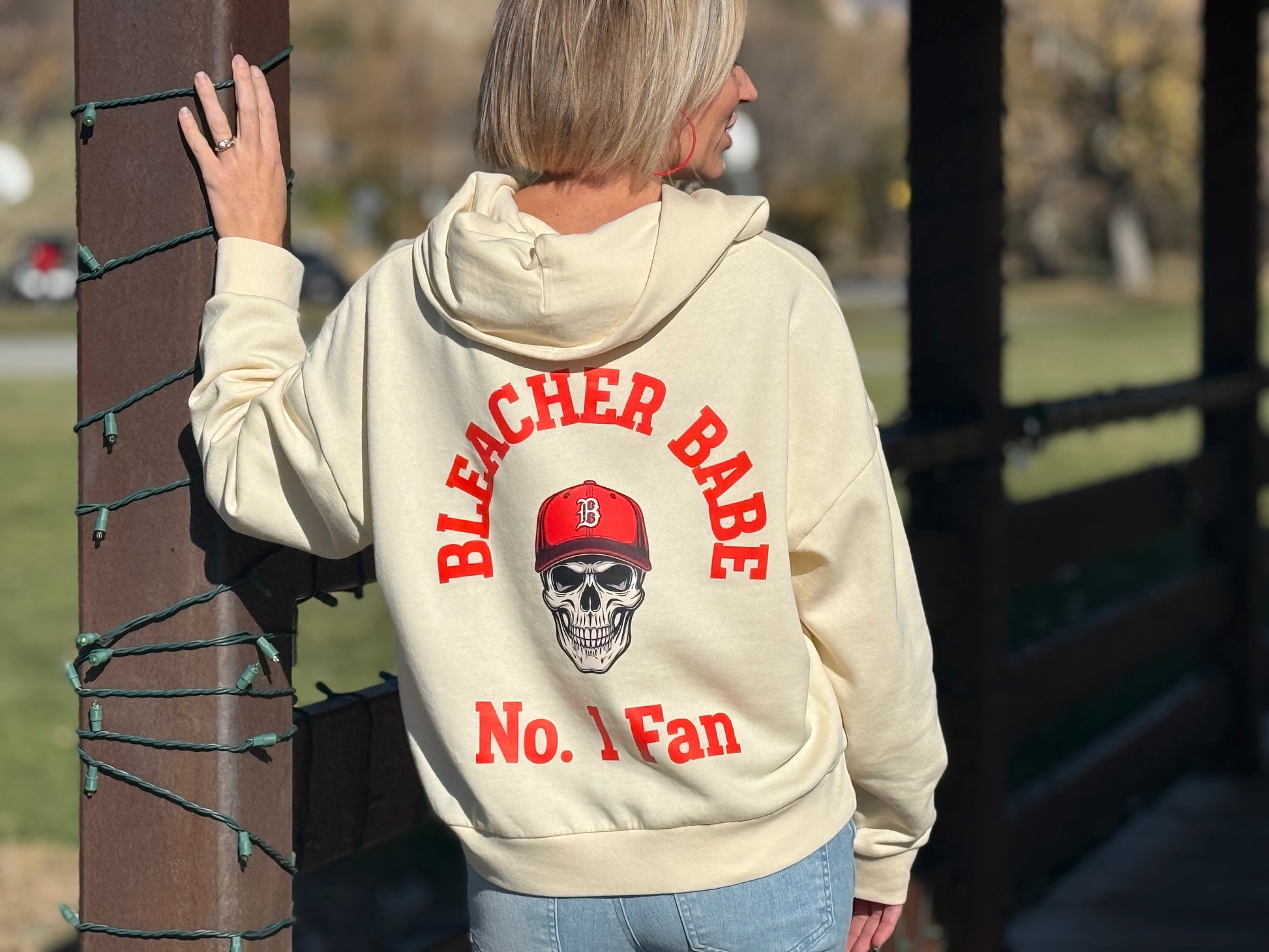 Bring the attitude to the sidelines in our Bleacher Babe #1 Fan Hoodie — the ultimate mix of cozy comfort and bold game-day energy. Featuring an edgy skull graphic rocking a red hat and our signature “Bleacher Babe #1 Fan” design on both the front and back, this hoodie is made for those who cheer loud, love hard, and rep their team with unapologetic style.