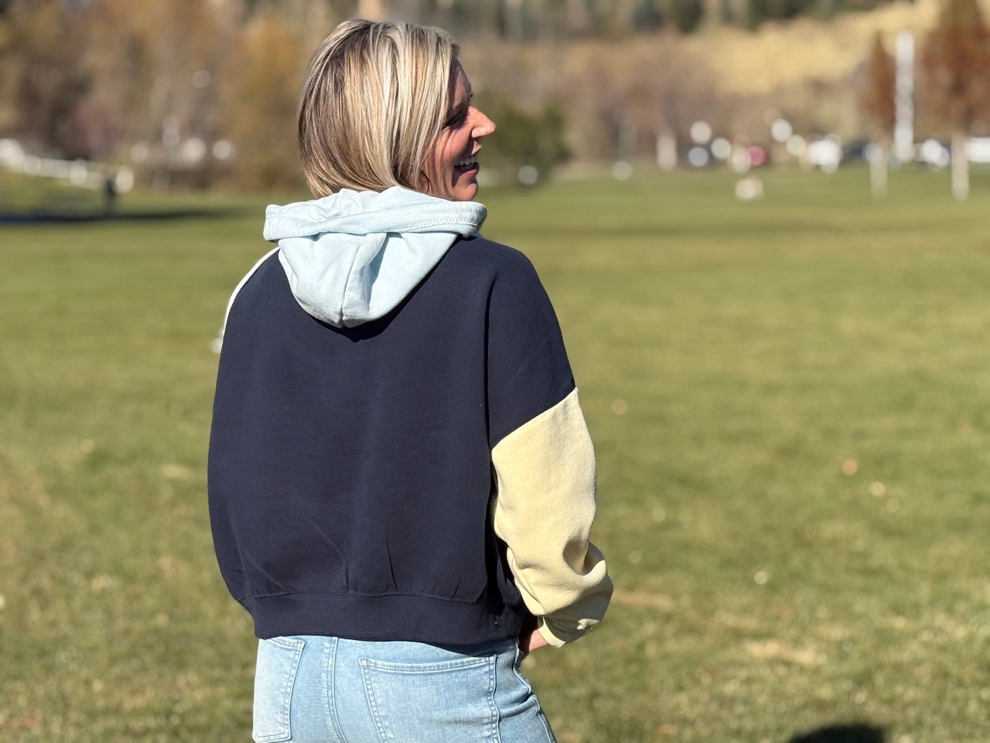 Sporty, bold, and effortlessly cool — our No. 25 Colorblock Cropped Hoodie brings all the game-day energy with everyday comfort. This navy hoodie features contrasting sleeves and a matching contrast hood, finished with the standout number 25 printed on the front for that perfect athletic vibe.