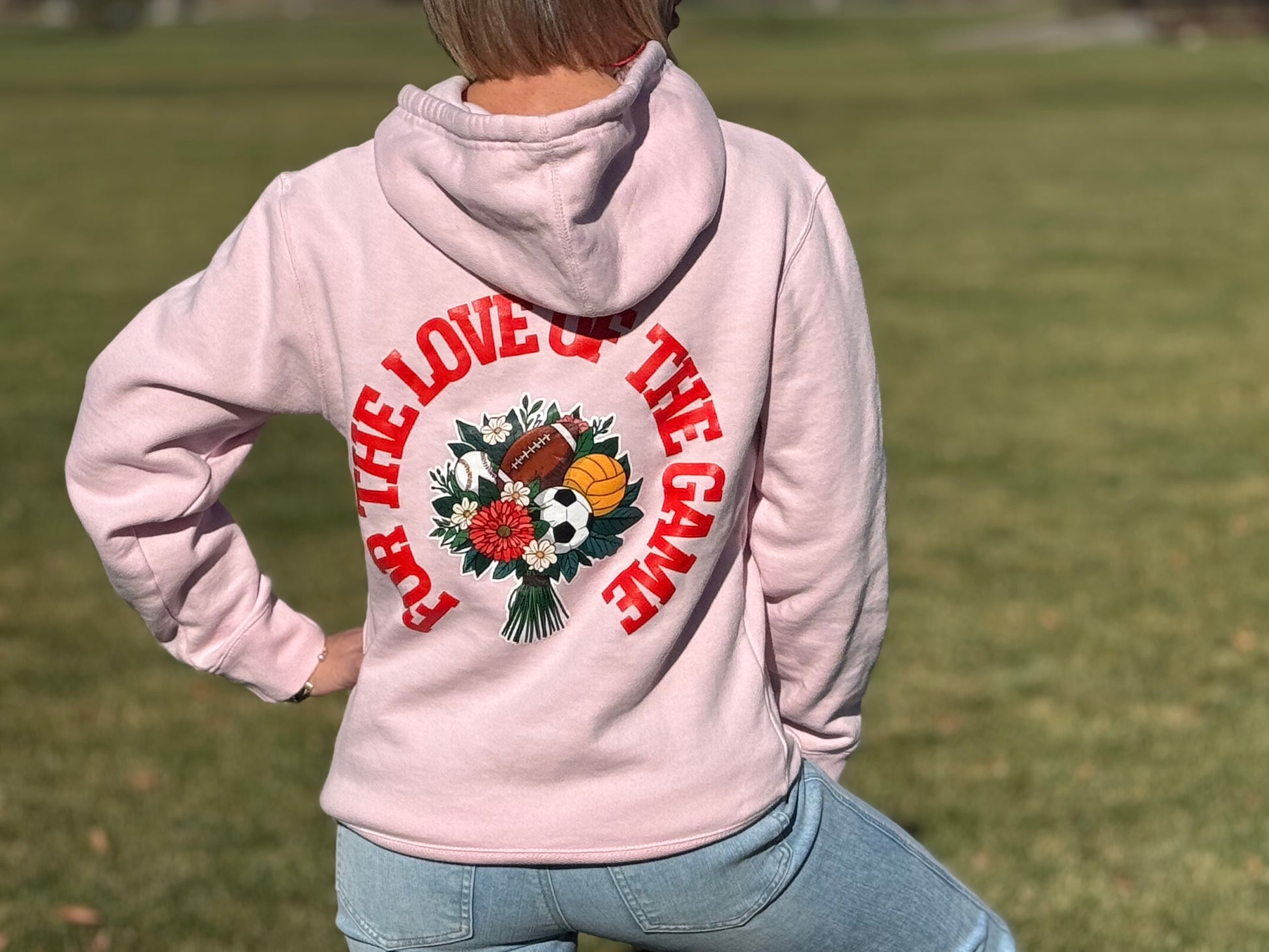 Celebrate your passion for every play, every team, and every moment in our For the Love of the Game Hoodie. This soft light pink pullover features our signature “For the Love of the Game” design on both the front and back, accented with a beautiful bouquet of flowers intertwined with classic sports balls — volleyball, baseball, soccer ball, and football — representing love for every sport.